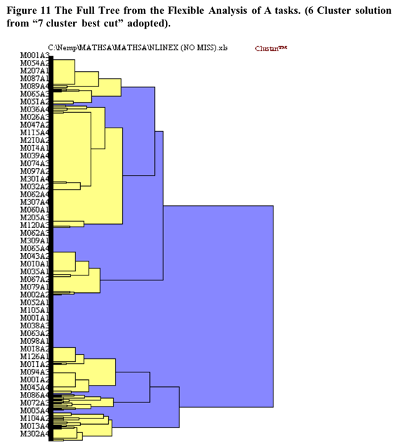 The heirarchical cluster solution was based upon the flexible cluster procedure with beta set to .25. Six cases were removed from the analysis as they became irreconcilable single case clusters due to the extent of missing data. The scree slope of the pseudo t statistic which led to the decision to utilise the six cluster solution is illustrated in Figure 12 below. The flattening out of the pseudo-t line past the 7 cluster point may be because the amalgamations between clusters past that point do not represent joinings between profoundly different clusters. Some support for the six cluster solution is found in the visual depiction of cluster solutions in Figure 13 below. Coloured versions of the figure showed that in general there tended to be a higher colour density within clusters than between clusters. This is particularly evident for the densities between clusters 4 and the other clusters. The colour map of proximities makes it clear that Cluster 5 is not well-defined with respect to the other clusters (particularly with regard to clusters 4 and 6). In terms of validation of the non-randomness of the cluster solution at 6 clusters, CLUSTAN GRAPHICS allowed the comparison of the series of fusion coefficients (distances) of the actual sample cluster pairs compared to a series of Bootstrap-derived sample cluster pairs. The results of this comparison is detailed in Figure 14 below. The largest deviations of the Bootstrap derived samples from the other samples is at 7 clusters. Based upon these results, the decision to utilise the 6 cluster solution in further analysis has justification. Qualitative
